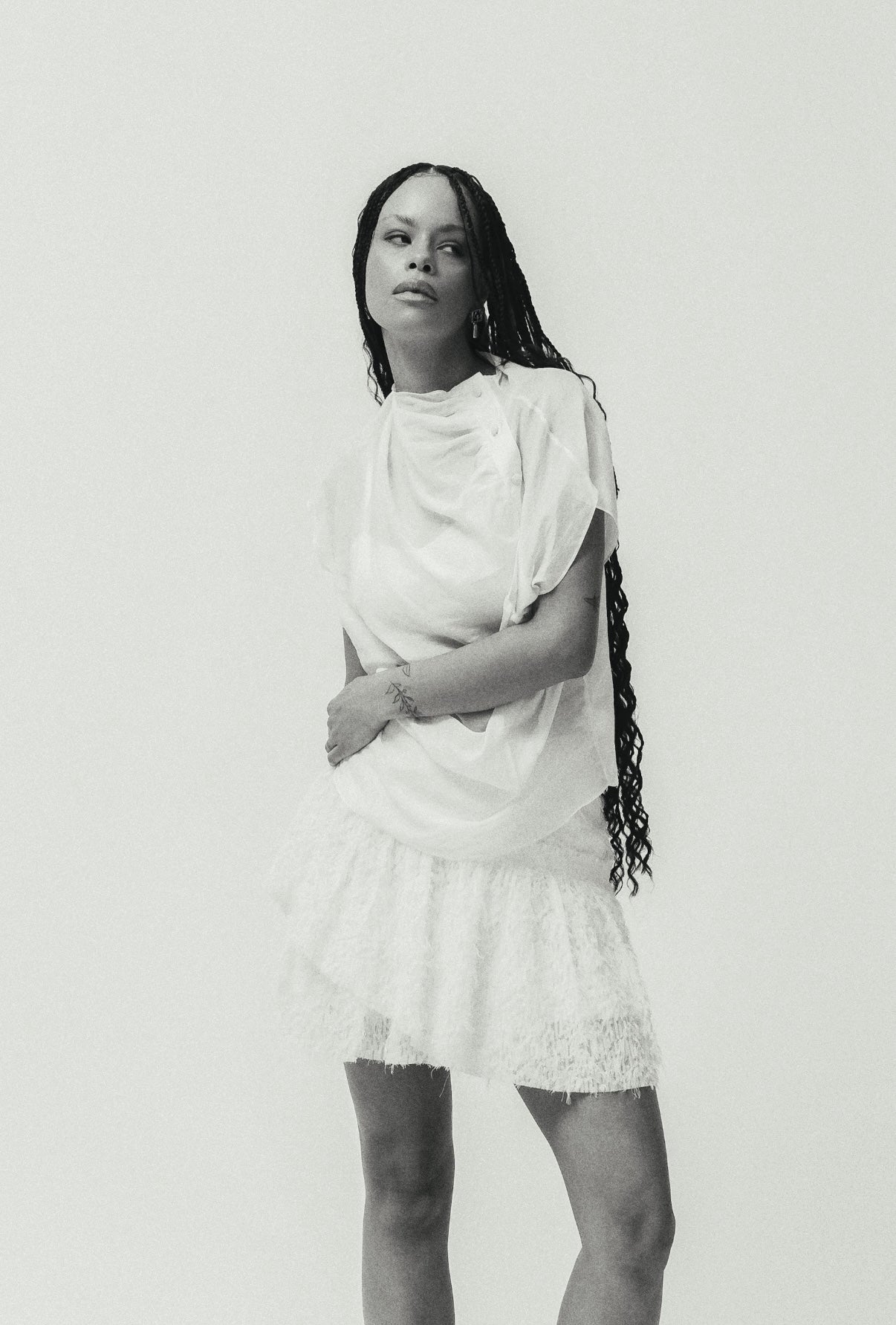 Blusa estilo japonesa com fechamento frontal por botões , gola alta e tecido semi transparente.