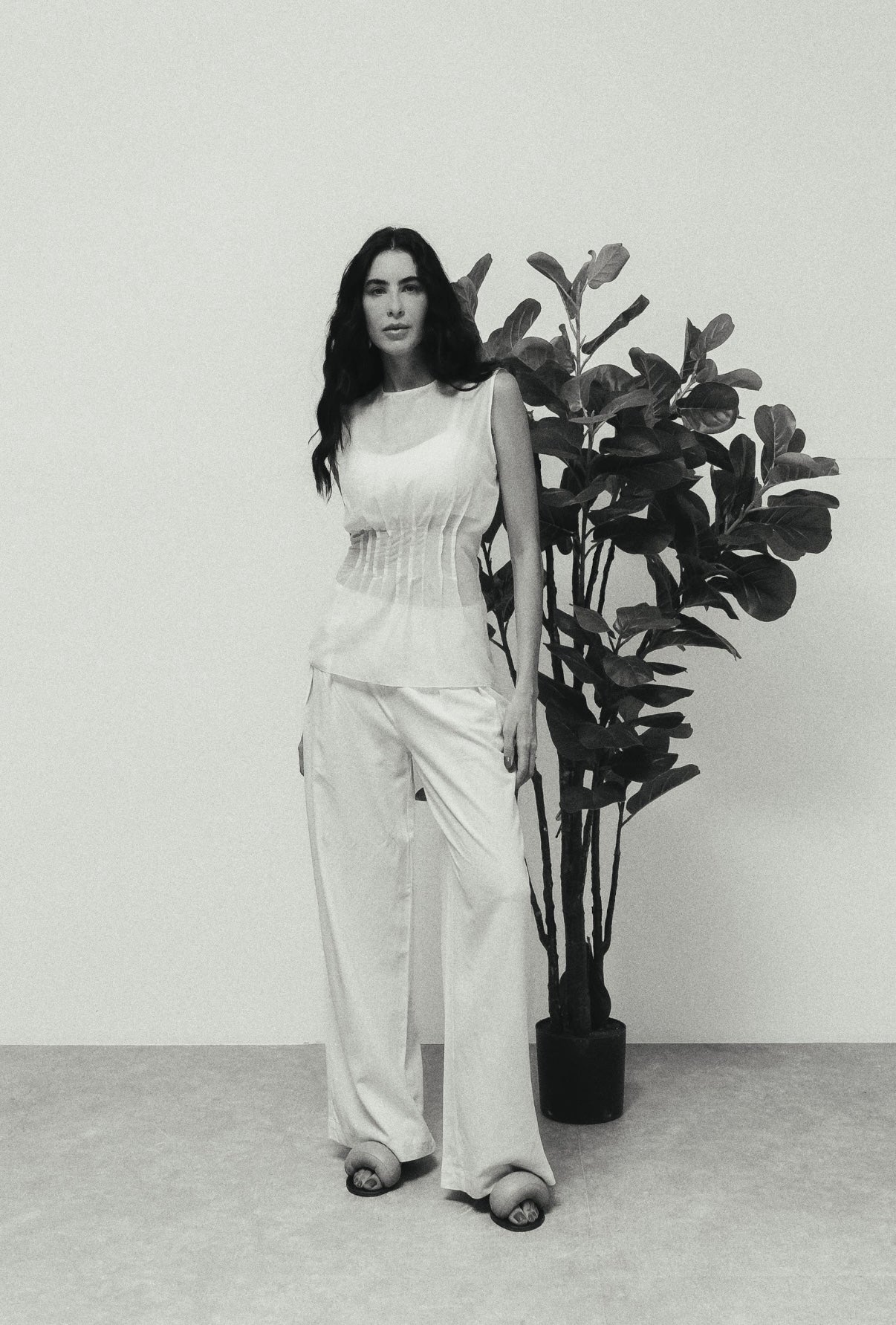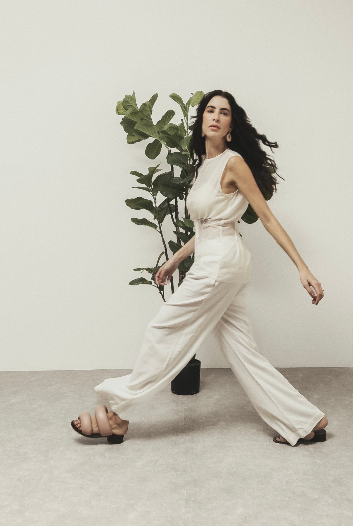 Calça em viscolinho , bolsos laterias e fechamento por zipper lateral.