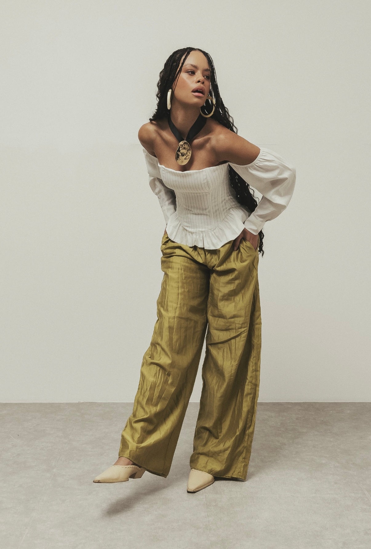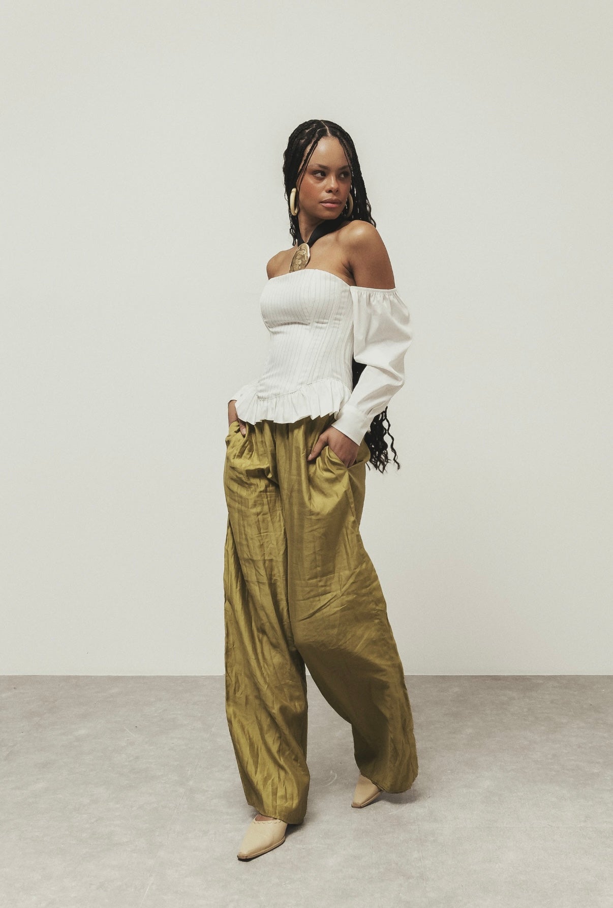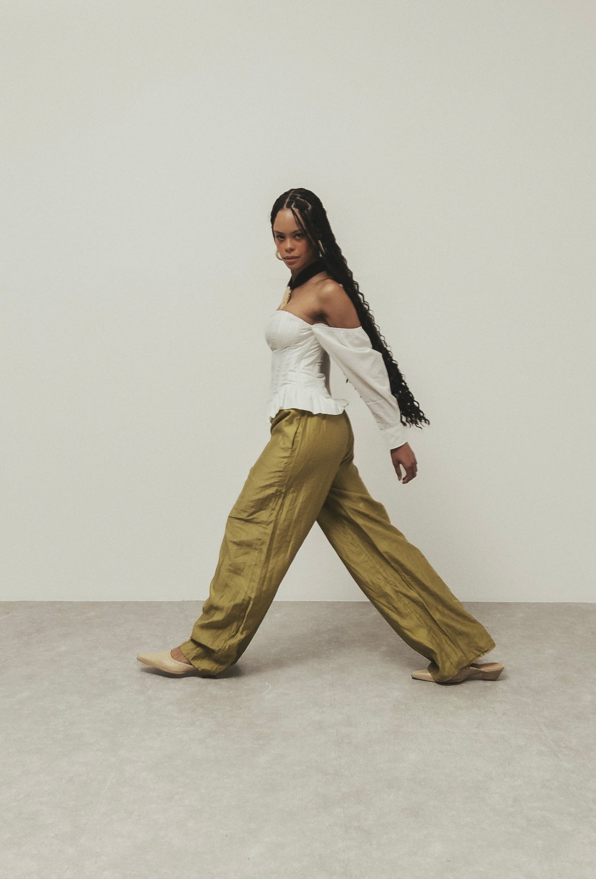 Calça textura de amassado na cor pistache. Cos em elástico , possui bolsos laterais.